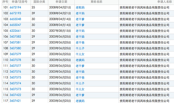 和阿里巴巴類似,公眾熟知的油制辣椒品牌“老干媽”所有者貴陽南明老干媽風(fēng)味食品有限責(zé)任公司,還注冊了“老干爹”、“老干娘”、“老干爸”、“干兒子”、“干兒女”、“老姨媽”等商標(biāo)。